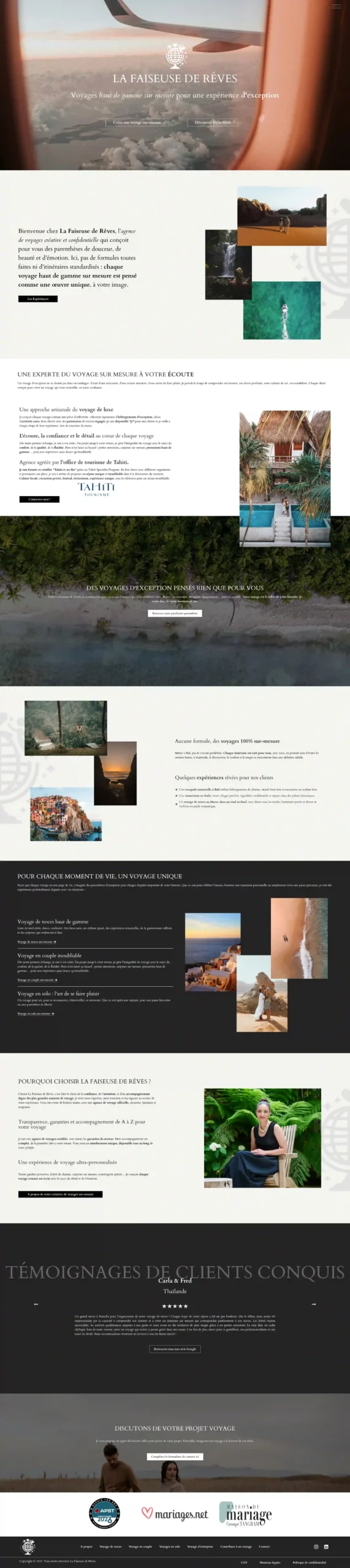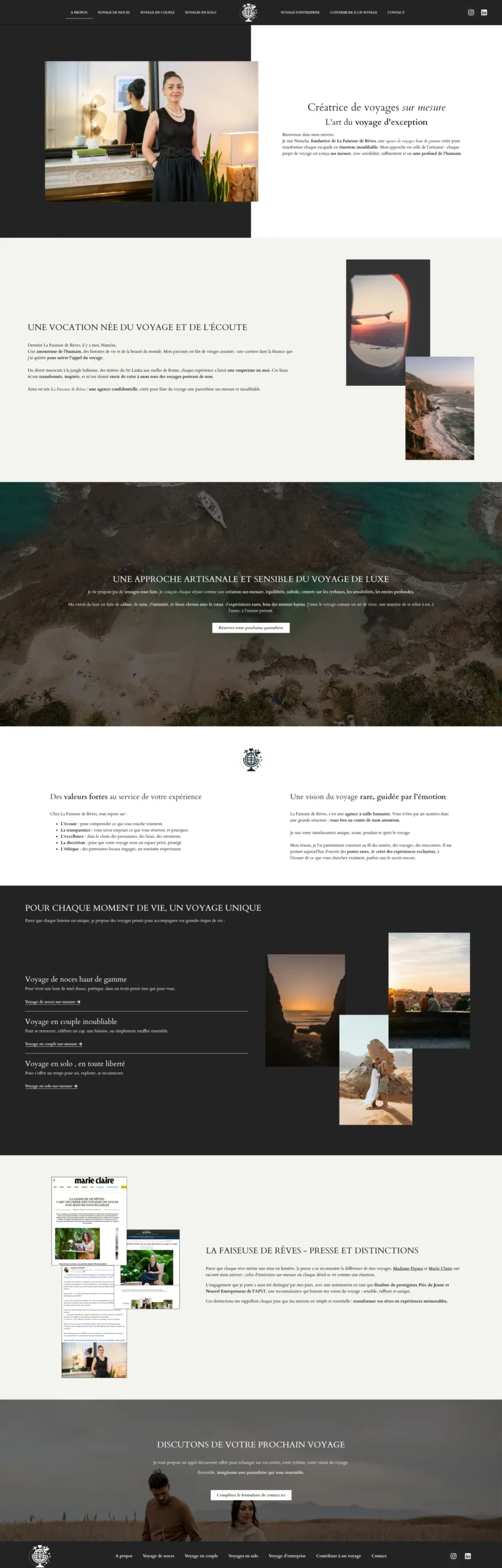 Le travail mené a consisté à structurer le site de façon plus cohérente, en mettant en valeur l’identité haut de gamme de l’agence, et en développant des pages dédiées pour adresser chaque typologie de voyage et chaque intention.